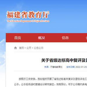 今天(1月25日)下午,福建省教育厅官网发布《关于省级达标高中复评及晋级评估审核通过名单的公示》。省教育厅基础教育处组织开展了省级达标高中复评及晋级评估工作。经审核,现将通过专家组评估的省级达标高中复评及晋级学校名单予以公示,公示后将适时提请会议研究审定。如有异议,可于公示期内来电来信来访反映。