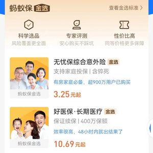 蚂蚁保“金选”是一个能对其代理的保险产品做综合对比,筛选出综合竞争力更强保险的系统。