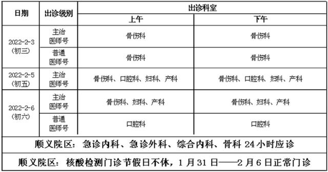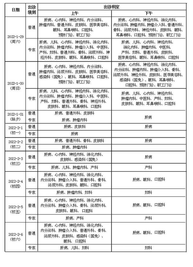 2。 内科、中医科、神经内科:2022年1月31日至2月6日(三十至初六)普通门诊、各级专家门诊全天应诊,专业门诊以当日为准。