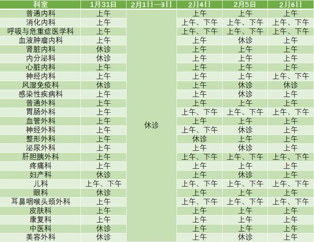 1月31日(除夕)上午半日普通门诊,停专家门诊。