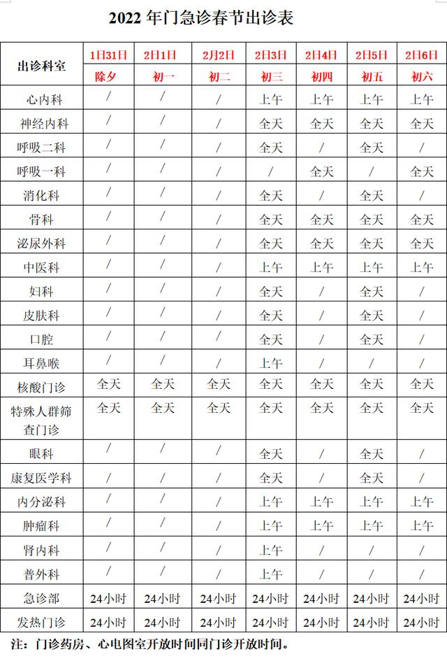 6。 血液专业:2022年1月31日、2月1日(三十、初一)上午半日门诊,2月2日(初二)全天门诊,2月3日(初三)上午半日门诊, 2月4日(初四)全天门诊,2月5日、2月6日(初五、初六)停诊。
