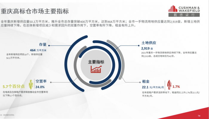 这份报告还指出,2021年全年重庆高标仓储物流市场新增供应量502000平米,推升全市总存量突破4000000平米,达到4640000平米。在电商及生鲜租户需求释放推动下,全市空置率同比下降5.7个百分点至24.0%。而在年底租户需求活跃带动下,租金同比上升1.7%至22.1元/平米/月。