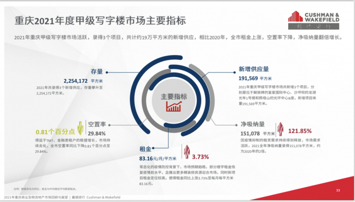 该研究报告指出,2021年重庆甲级写字楼市场新增3个供应,分别是位于解放碑、沙坪坝和照母山等区域,新增项目体量191569平米,存量攀升至2254172平米。因疫情抑制的租赁需求持续得到释放,2021全年净吸纳量151078平米,约为2020年的2倍。得益于TMT、金融类租户的稳健增长,全市空置率同比下降0.81个百分点。随着更多精装修房源面市,租金也同比上涨3.73%至每月每平米83.16元。