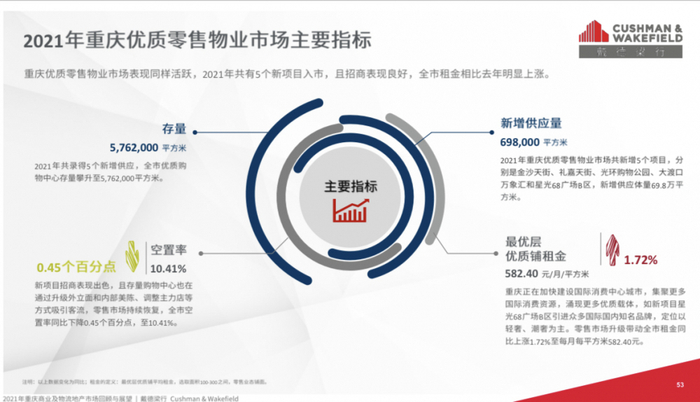 报告还表明,近一年来,重庆优质零售物业市场共有5个新增供应,分别是金沙天街、礼嘉天街、光环购物公园、大渡口万象汇和星光68广场B区,新增供应体量698000平米。全市优质购物中心存量攀升至5762000平米。