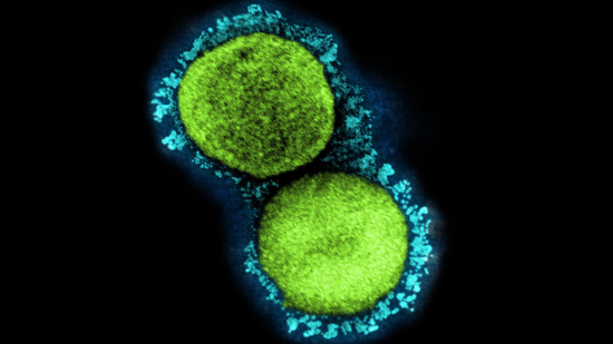 显微镜下的Omicron变种新冠病毒。