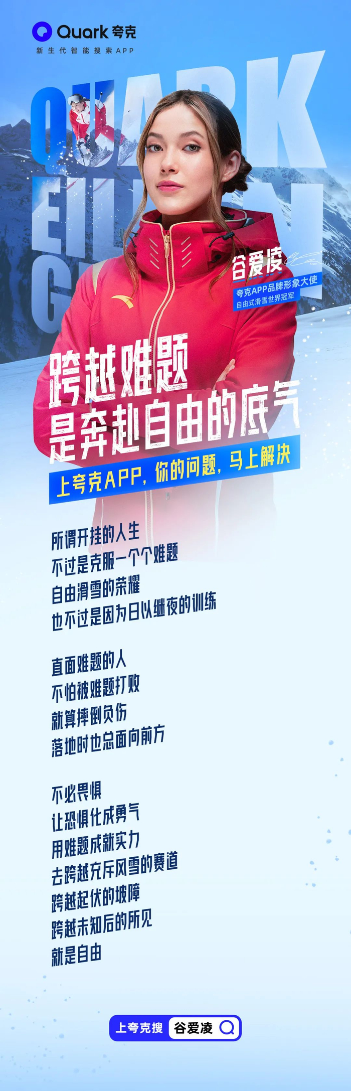 正如官宣海报说的那样——跨越难题,是奔赴自由的底气。说的即是谷爱凌又是夸克APP,更是夸克APP所服务的用户。