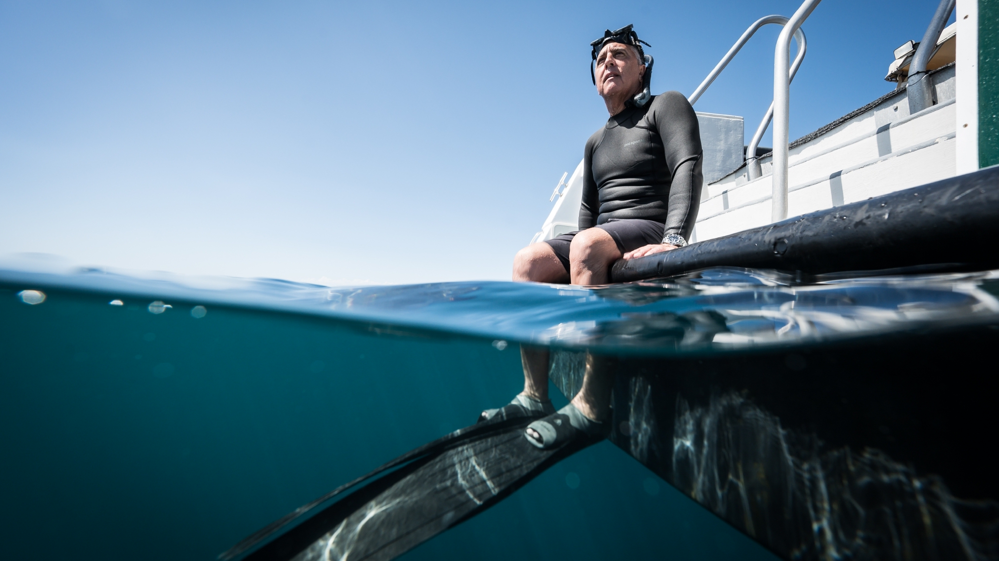 布拉德·诺曼解释为鲸鲨系上追踪器的技术。©Rolex/Franck Gazzola