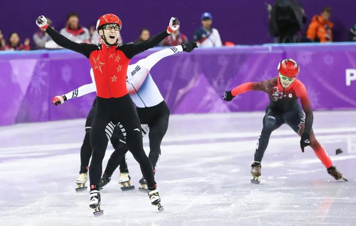 2018年2月22日,在平昌冬奥会短道速滑男子500米决赛中,中国选手武大靖夺冠后庆祝。韩岩 摄