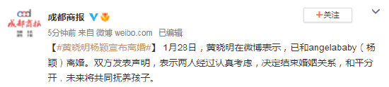 1月28日,黄晓明在微博表示,已和angelababy(杨颖)离婚。双方发表声明,表示两人经过认真考虑,决定结束婚姻关系,和平分开,未来将共同抚养孩子。