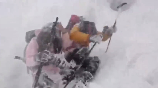 随后,视频中出现两个坐在雪地中,身上裹着厚厚积雪的人。有人说:“雪崩,对啊,这就是雪崩。”