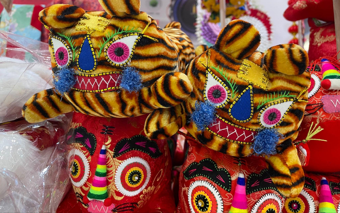 虎年春节马上来临,蒋丽娟的生意比往年要好很多,除了虎头鞋,蒋丽娟还做了虎头帽、虎头斗篷、虎头马甲、虎头肚兜、虎头口水兜以及虎头五彩线手链,在“虎文化展”上销售。