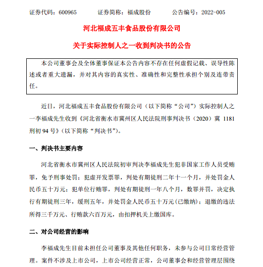 A股牛年的最后一个交易日,河北福成五丰食品股份有限公司(600965,SH,下称福成股份)发布了一则《公司实控人之一收到判决书》公告。