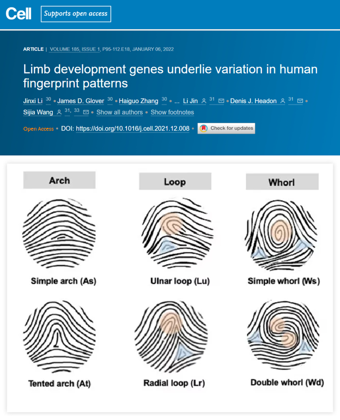 2022年1月7日,一项由复旦大学与中国科学院上海营养与健康研究所发表在《细胞》杂志上的研究表明,指纹中的“斗”和“簸箕”虽然无关“穷达”,但却隐含着健康信息。这是因为皮肤纹路受关键肢体发育基因影响,与生长发育及疾病有关。①
