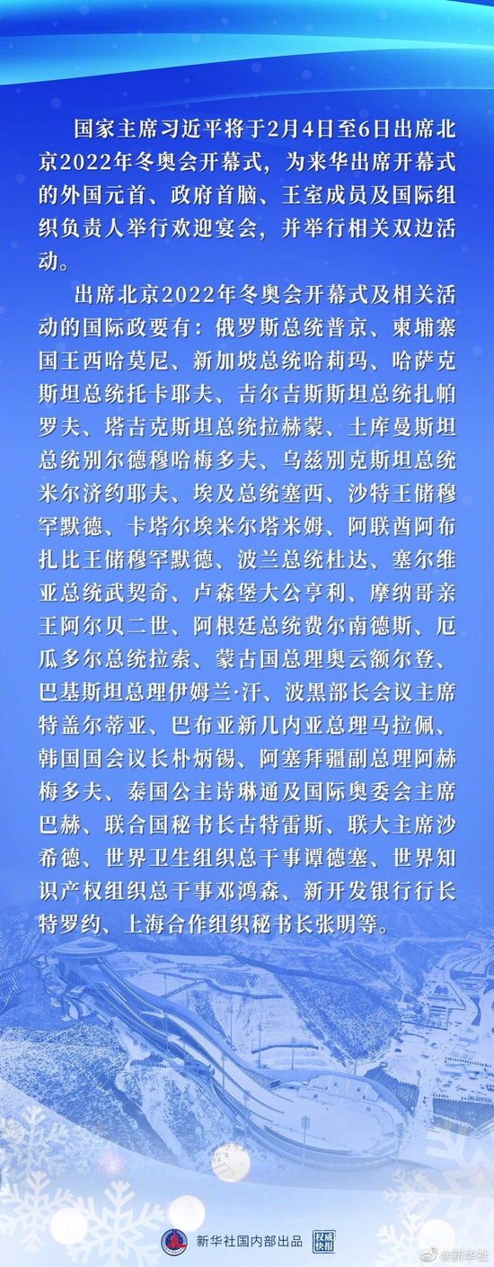 1月25日,习近平主席主持中国同中亚五国建交30周年视频峰会,中亚五国元首在峰会上均表示,热切期待赴华出席北京冬奥会开幕式,表达了他们对北京冬奥会的支持。从今天发布的名单看,五国元首均在其列。