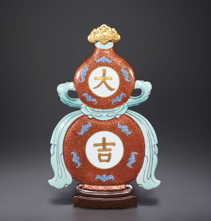 于正面葫芦上下各饰一金彩圆形开光,里面分别以金彩楷书“大”“吉”二字;