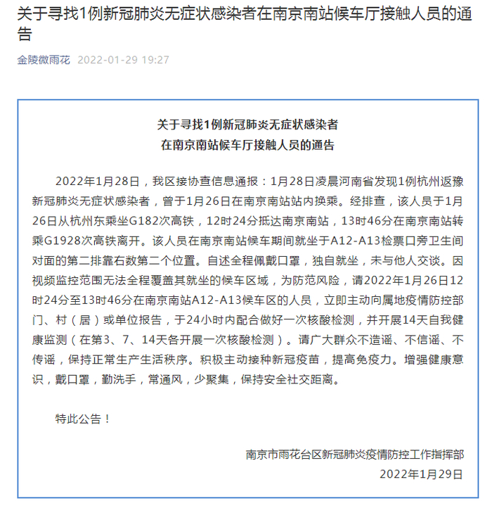 1月29日,南京市雨花台区新冠肺炎疫情防控工作指挥部发布《关于寻找1例新冠肺炎无症状感染者在南京南站候车厅接触人员的通告》,具体内容如下: