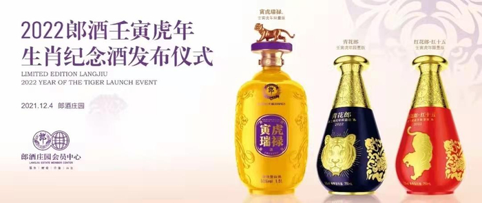 其中寅虎瑞禄酒以中国传统工艺品灯笼形象为灵感,采用浮雕剪纸卷草纹,帝王黄上釉外加镀金瑞虎立于盖头,以手提箱造型包装,并采用皮革材质提升精致度;青花郎与红花郎虎年生肖纪念酒则延续水滴瓶型,其中青花郎款将金虎造型与卷草图案环绕瓶身;红花郎款以立体浮雕“猛虎下山”造型镶嵌瓶体,象征厚积薄发,运势通达的寓意。