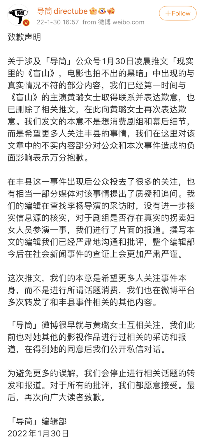 随后,曾在30日发布推文《现实里的<盲山>,电影也拍不出的黑暗》的“导筒directube ”编辑部在微博发文称,已经删除相关推文,向黄璐表达歉意,并称编辑在查找《盲山》导演李杨的采访时没有进一步核实信息源,对剧组是否存在真实的拐卖妇女人员参演一事进行了片面的报道。