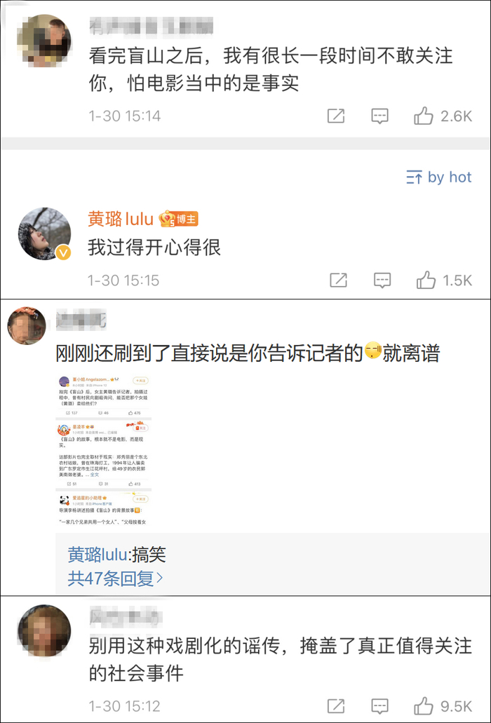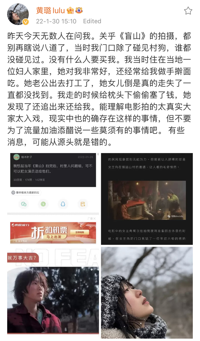 30日15时10分,《盲山》主演黄璐在微博发文称:“关乎《盲山》的拍摄,都别再瞎说八道了,当时我门口除了碰见村狗,谁都没碰见过。没有什么人要买我。我当时住在当地一位妇人家里,她对我非常好,还经常给我做手擀面吃。她老公出去打工了,她女儿倒是真的走失了一直都没找到。我走的时候给枕头下偷偷塞了钱,她发现了还追出来还给我。”
