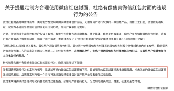 微信官方此前也发布提示公告称,微信红包封面是微信推出的,供定制方在定制并购买微信红包封面后,无偿向用户进行发放的一款创意产品。自推出之日起,微信就明确规定,定制方不得因为微信红包封面而以任何形式,向用户收取任何费用。