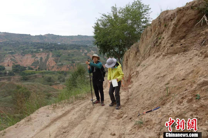 2020年,孙博阳(左)在甘肃临夏盆地野外考察,进行剖面测量。中新社发 受访者供图