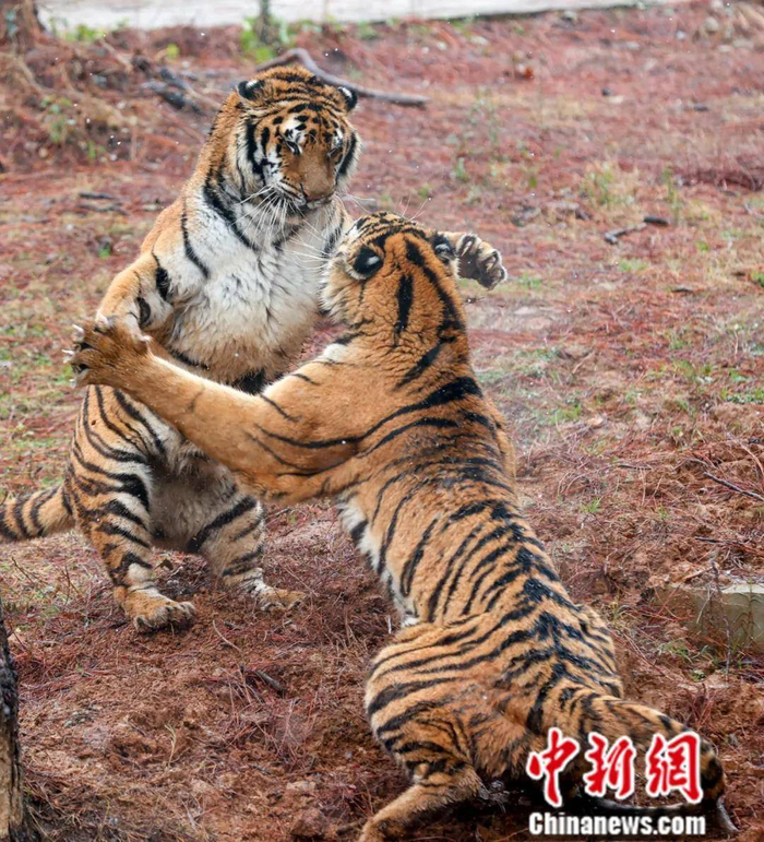 2022年1月29日,武汉九峰森林动物园里,两只东北虎在嬉戏打闹。中新社记者 张畅 摄