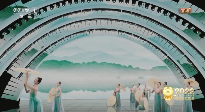 节目开始,浙江歌舞剧院、浙江音乐学院舞蹈学院、杭州歌剧舞剧院的小姐姐着青绿色服装,撑着油纸伞出场,瞬间将人带回江南。