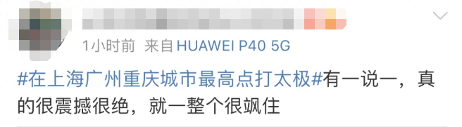 三位表演者分别站上上海中心大厦(中国第一高楼632米)、上海白玉兰大厦(320米)、重庆联合国际大厦 (318米)、广州塔("小蛮腰",中国第一高塔454米)表演太极。