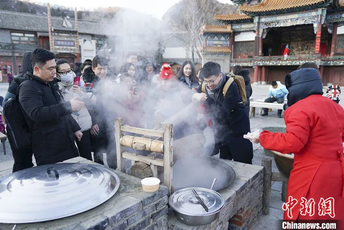 2020年1月,北京司马台长城脚下的古北水镇景区举行“长城庙会过大年”活动,游客可体验庙会市集、民间花会、庙会小吃、街头民艺、冰上运动、露天温泉、夜赏花灯等活动。图为游客体验压制饸饹面。中新社记者 苏丹 摄