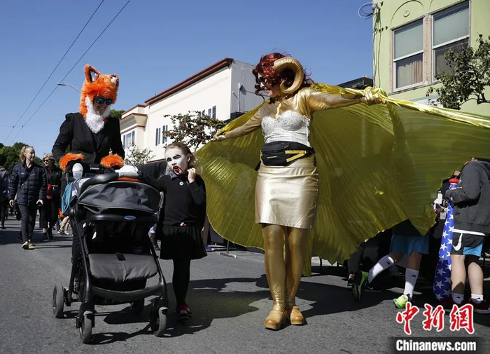 2019年10月,万圣节服饰游行在美国旧金山举办,人们穿上风格各异的服装,迎接万圣节的到来。中新社记者 刘关关 摄