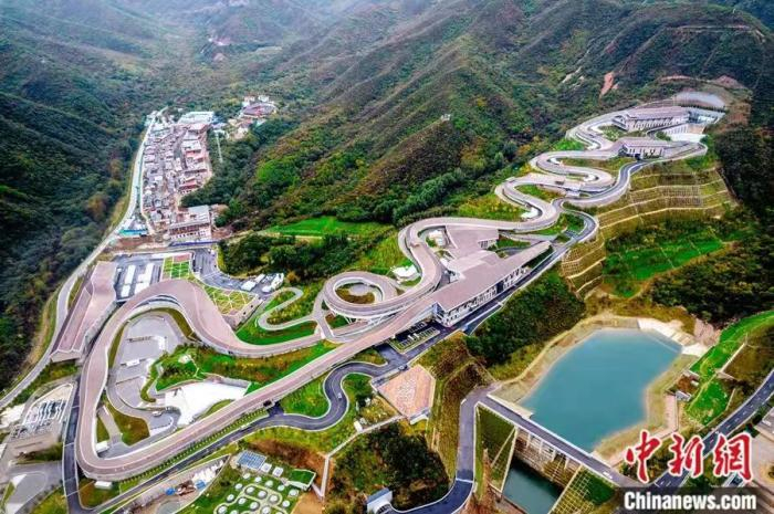 北京市延庆区,长城脚下、妫水之滨的小海陀山上,国家高山滑雪中心依山而建。从海拔2198米的山巅向下俯瞰,国家高山滑雪中心“雪飞燕”7条雪道犹如白色瀑布,由山顶向山谷蜿蜒“流淌”。中新社记者 蒋启明 摄