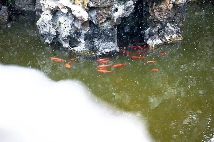 三候,鱼陟负冰丨再五日“鱼陟负冰”,陟(zhì)是升,鱼因水底暖,感知阳气而上升,冰尚未消融而负冰。“立雪鹤深睡,负冰鱼聚沉”,春气还弱。
