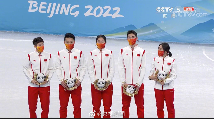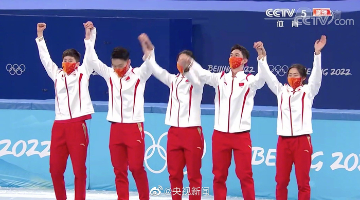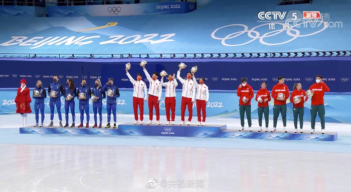 中国短道速滑混合接力队站上最高领奖台(央视)