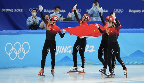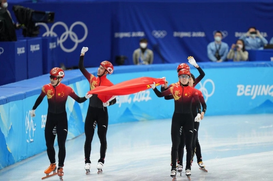 2月5日晚间,首都体育馆,鲜艳的中国红第一个冲过终点线!曲春雨、范可欣、武大靖、任子威在短道速滑混合团体接力的比赛中,以2分37秒348的成绩夺冠,拿下中国代表团在北京冬奥会的首个金牌!