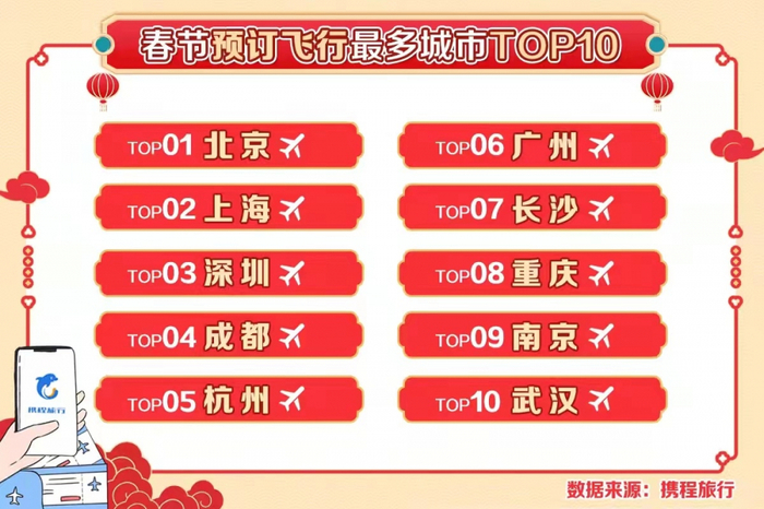 2月6日,携程发布的《2022年春节旅游总结报告》显示:农历初五、初六为今年春节假期返程高峰期;在春节返程目的地机票预订排名中,上海、北京、深圳、广州、成都、杭州、三亚、重庆、南京、海口位列前十。