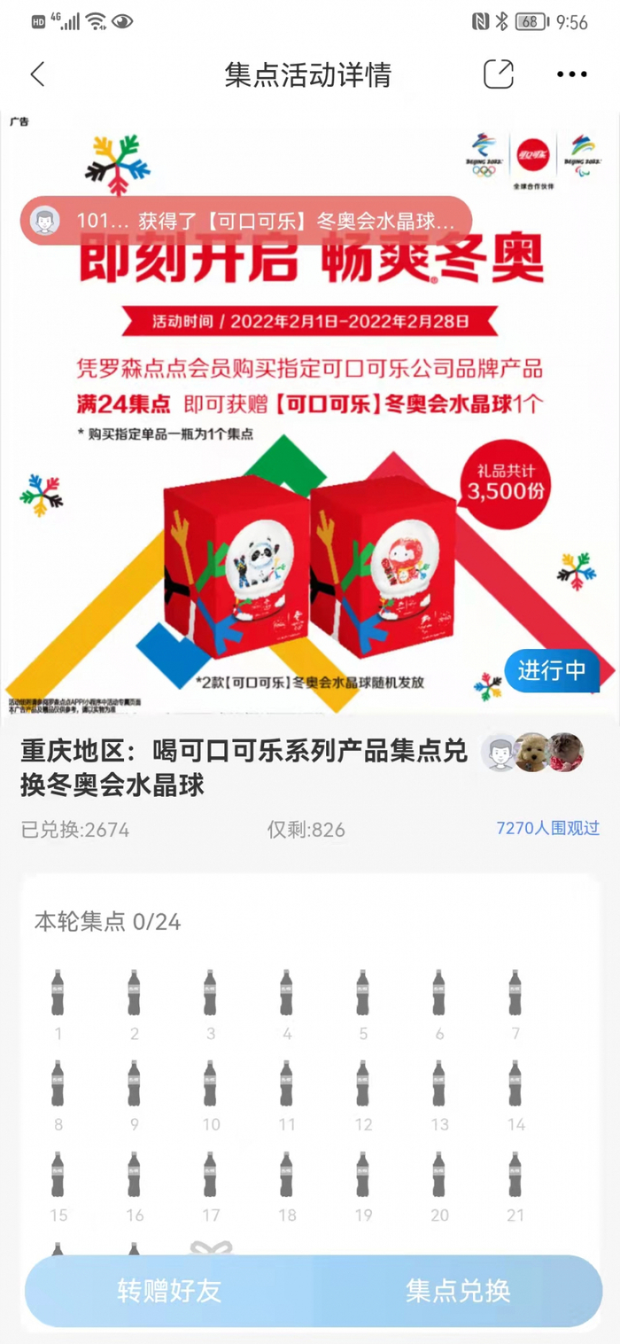 罗森便利店的活动,购买24瓶可口可乐系列产品,相当于积满24个集点,就可以兑换一个冰墩墩或雪容融的水晶球。不过,记得购买前一定要打电话问下门店库存。