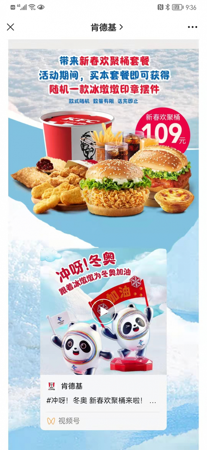 来自肯德基的新春欢聚桶套餐,里面包含常规的汉堡、可乐、薯条、蛋挞等,还包括随机一款冰墩墩印章摆件,总价109元,冰墩墩几乎就没怎么花钱。缺点是这一款套餐仅在部分省份的门店有售,且仅限堂食,外卖是买不到的,目前很多地方均已无货。