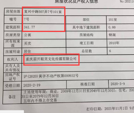 在相关登记信息中标识着,这套房源的权利人是重庆眉开眼笑文化传媒公司。天眼查App显示,该公司为谢娜关联公司,成立于2019年10月,法定代表人为罗正英,谢娜持股99%并担任监事,为疑似实际控制人。