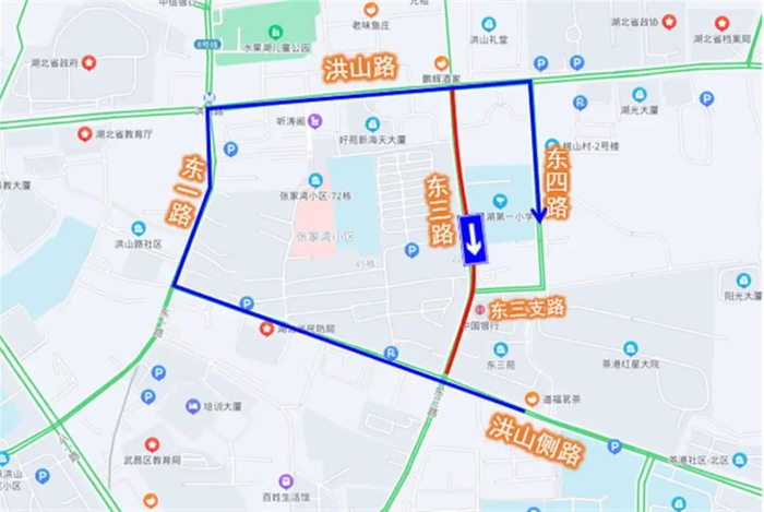 3.原经东三路往东三支路及东四路方向车辆,可绕行洪山侧路、东一路、洪山路。