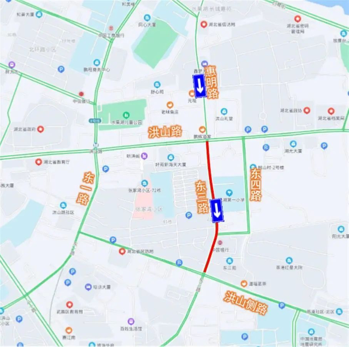 因为道路施工,2月8日至4月30日,武昌区水果湖东三路(洪山路至洪山侧路)改为单向通行:机动车一律由北向南(洪山路往洪山侧路方向)单向通行。