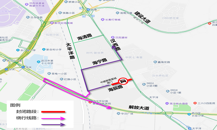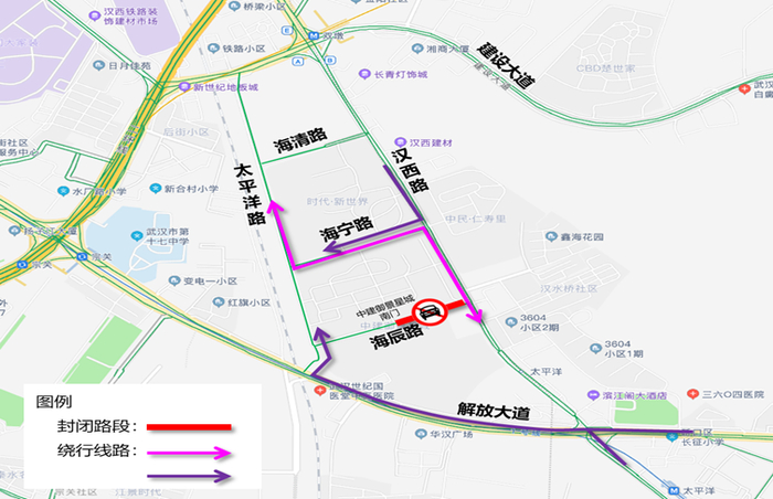 2.中建御景星城小区车辆,可往西通过太平洋路绕行解放大道,或经海宁路去往汉西路方向。