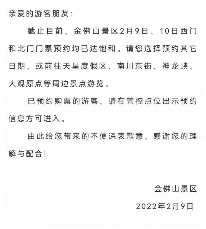 2月9日,南川金佛山景区发布公告称,截止目前,金佛山景区2月9日、10日西门和北门门票预约均已达饱和。