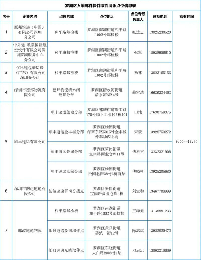 附表:罗湖区入境邮件快件取件消杀点位信息表