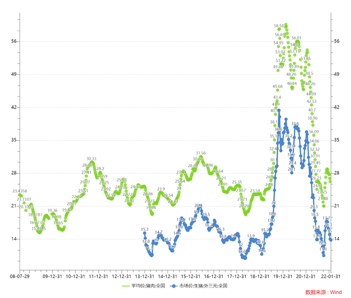本轮周期的下行从2021年1月开始,全国猪肉平均价格从54.22元/公斤持续下降,7月有小幅波动,此后继续下降,到10月中旬下降到21.03元/公斤后连涨近两月,12月上旬到28.91元/公斤后,又开始下降。生猪(外三元)市场价格也在去年1月从36.8元/公斤下降,至10月上旬的最低点10.5元/公斤后上涨,到11月下旬的18.2元/公斤后开始下跌。据国家统计局最新公布的数据,2022年1月下旬生猪(外三元)价格为13.8元/公斤。