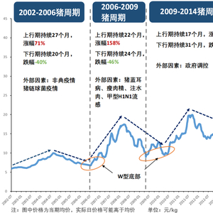 根据国海证券,2002年至2006年的这轮猪周期,上行周期为2002年7月到2004年8月,下行周期为2004年9月至2006年7月;2006年至2009年的这轮周期,上行周期为2006年8月至2008月3月,下行周期为2008年4月至2009年5月。
