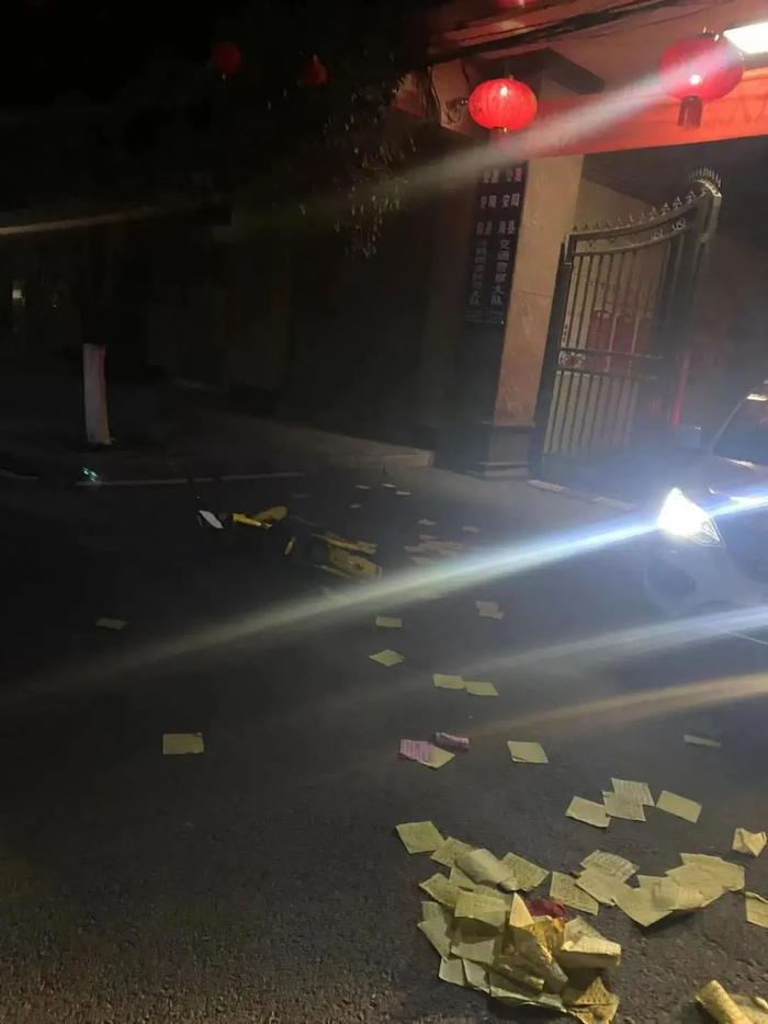 2022年2月5日22时左右,桂林市灌阳县公安局交通管理大队门口出现了三个黑影,他们把一堆纸钱(冥币)扔下后迅速逃离现场。2022年2月6日,灌阳警方将三人全部抓获。