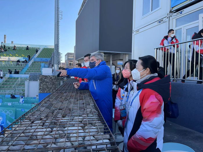 决赛是在当天上午10时开始,9时30分,巴赫主席就已到了首钢滑雪大跳台的大家庭休息室。在场馆主任宋世媛等人陪同下,他先后来观景台和二层看台区,寻找观赛的最佳点位。“这是属于年轻人的比赛,我必须要看。我喜欢创新,更希望推广这个新加入冬奥会的项目。”巴赫主席兴奋地说。在二层观景台,他指向大跳台方向,“我见证了这个伟大建筑的诞生。我关注它七年了,它实现了竞赛场馆与工业遗产再利用、城市更新的完整结合。”顺着他手指的方向看过去,涂刷了冬奥会徽的冷却塔巍然矗立,呈现出别具一格的工业风景象。随后,巴赫主席前往运动员观赛席,与参赛选手的队友们共同观赛并进行亲切的交流。