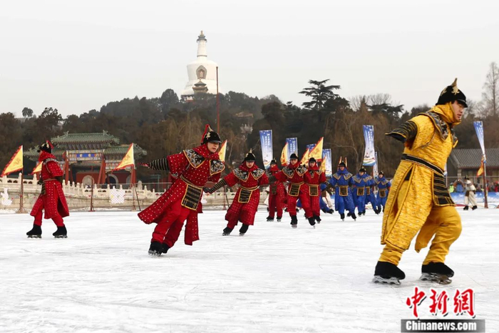 2016年1月20日,大寒节气,表演者穿着清朝八旗服饰在北京北海公园上演皇家“冰嬉”。中新社记者 富田 摄
