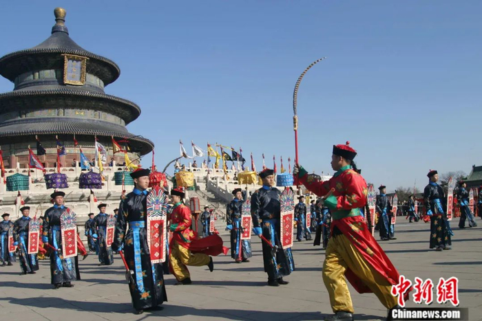 2004年1月,祭天乐舞表演在北京天坛祈年殿前进行着装彩排。中新社记者 盛佳鹏 摄