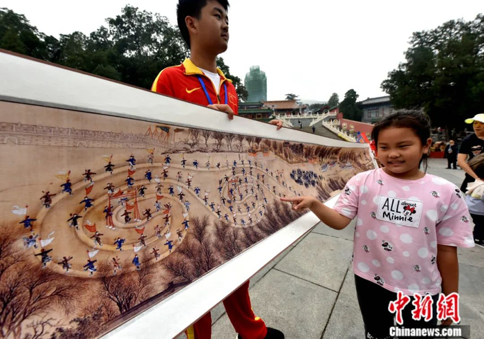 2021年10月3日,在北京八大处国庆游园会上,《冰嬉图》复制展品吸引游人的目光。中新社发 李文明 摄
